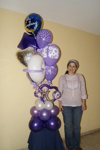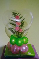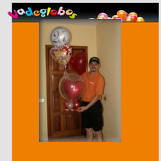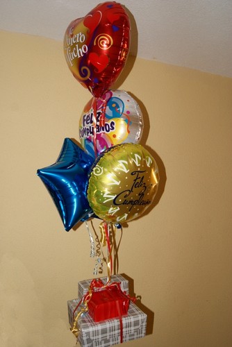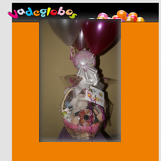 Tarta de pañales compuesta por Pañales, Chupa, Calcetines, perchitas, Biberon, Babero, Batita de bebé, Bastoncillos de algodon, Talco, Gorra, Bufanda, Limpia Biberon, Peluche con Tarjeta de Felicitación, Cintas y Papel decorativo, acompañado por Ramo de Globos.